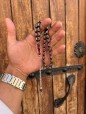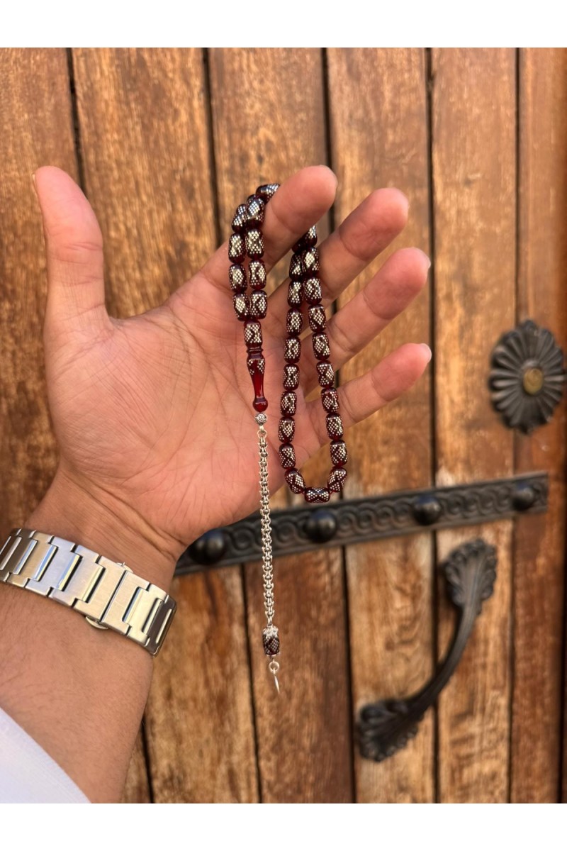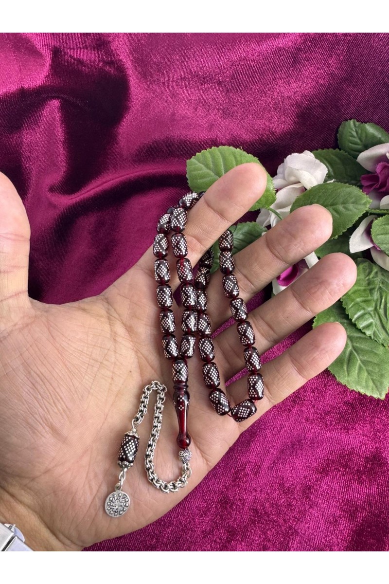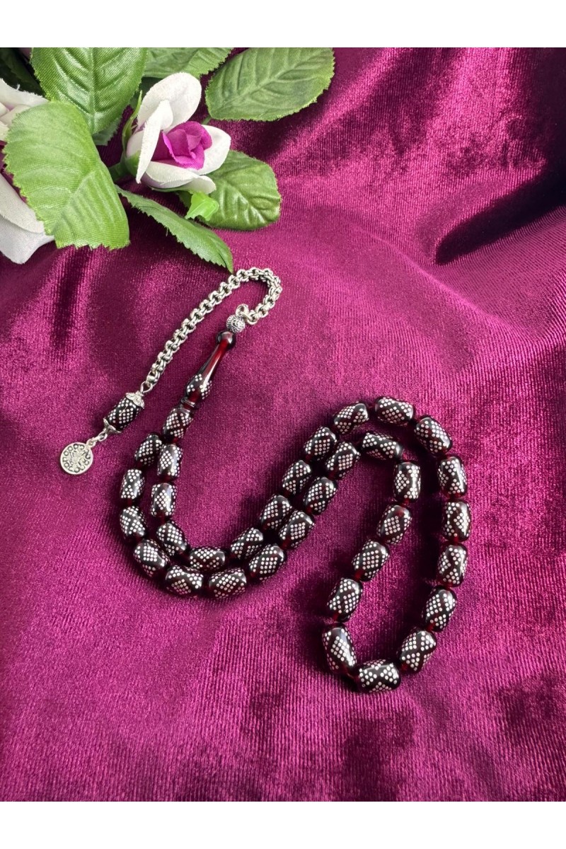 925 ayar Gümüş işlemeli ve gümüş püsküllü ateş kehribar tesbih - SG20231616