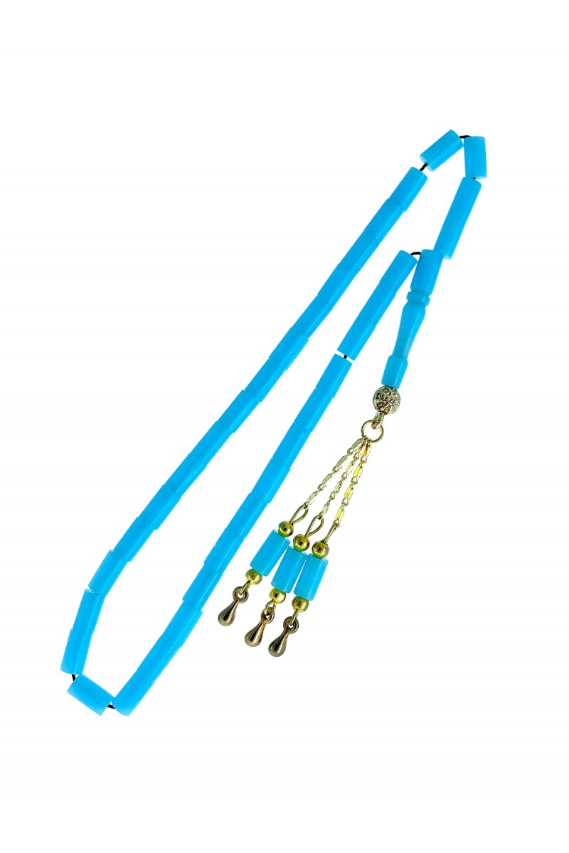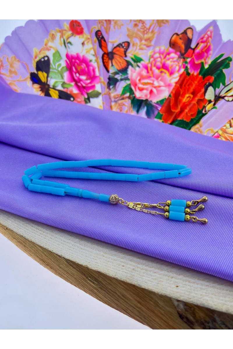 Açık Mavi Renkli 18 Ayar Altın Kaplama Kesme Ateş Kehribar Tesbih - SG20230648