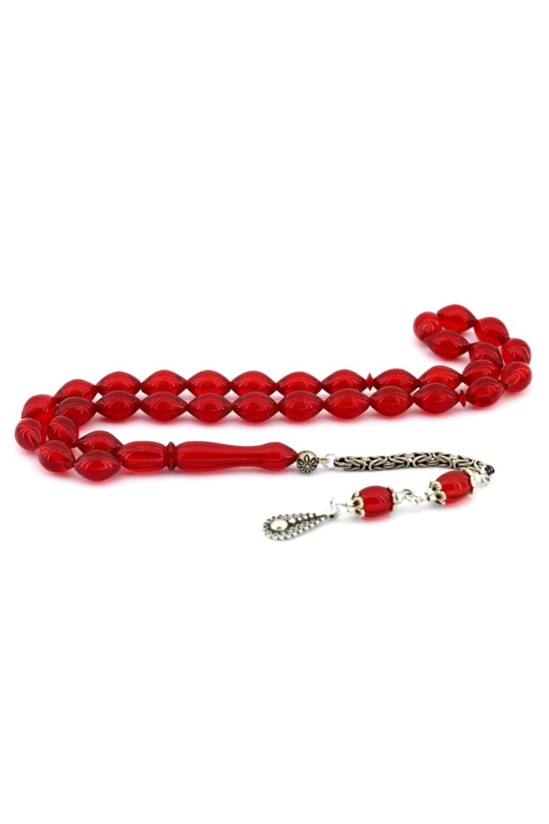 Arpa Kesim Kırmızı Gümüş Püsküllü Sıkma Kehribar Tesbih - SG20230406