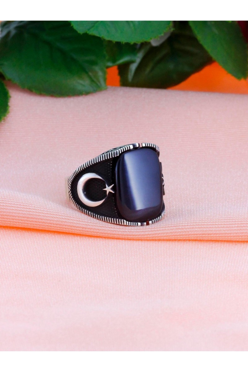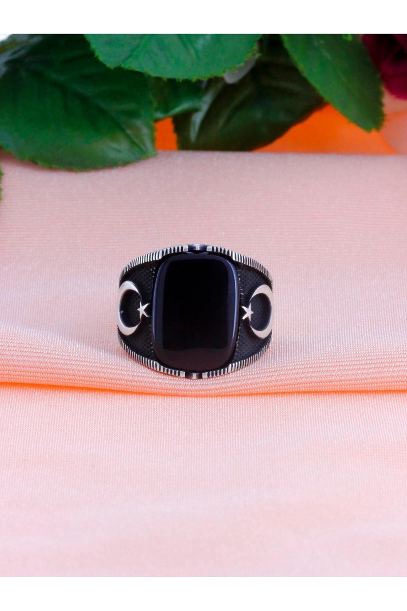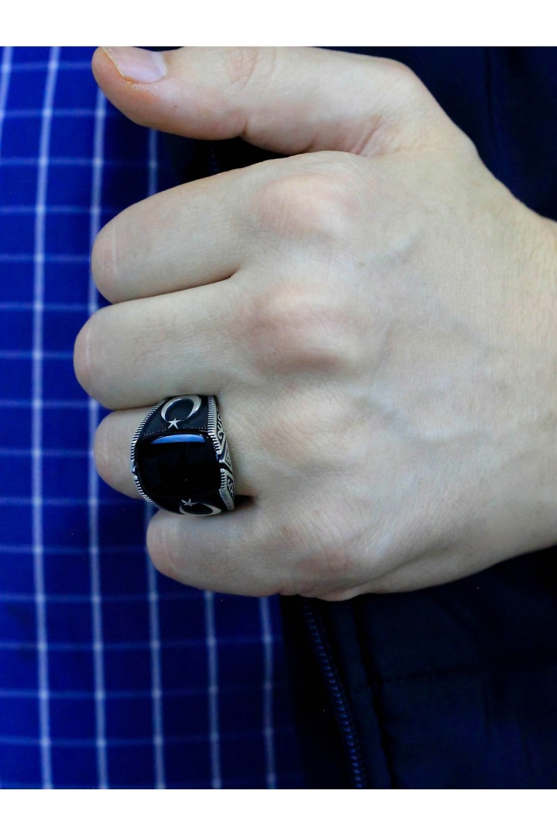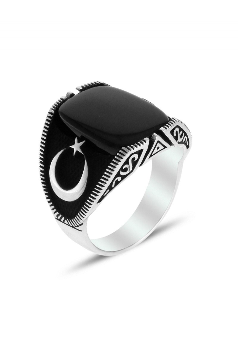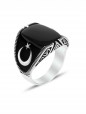 Ayyıldız İşlemeli Oniks Taşlı Erkek Gümüş Yüzük - SG20230801