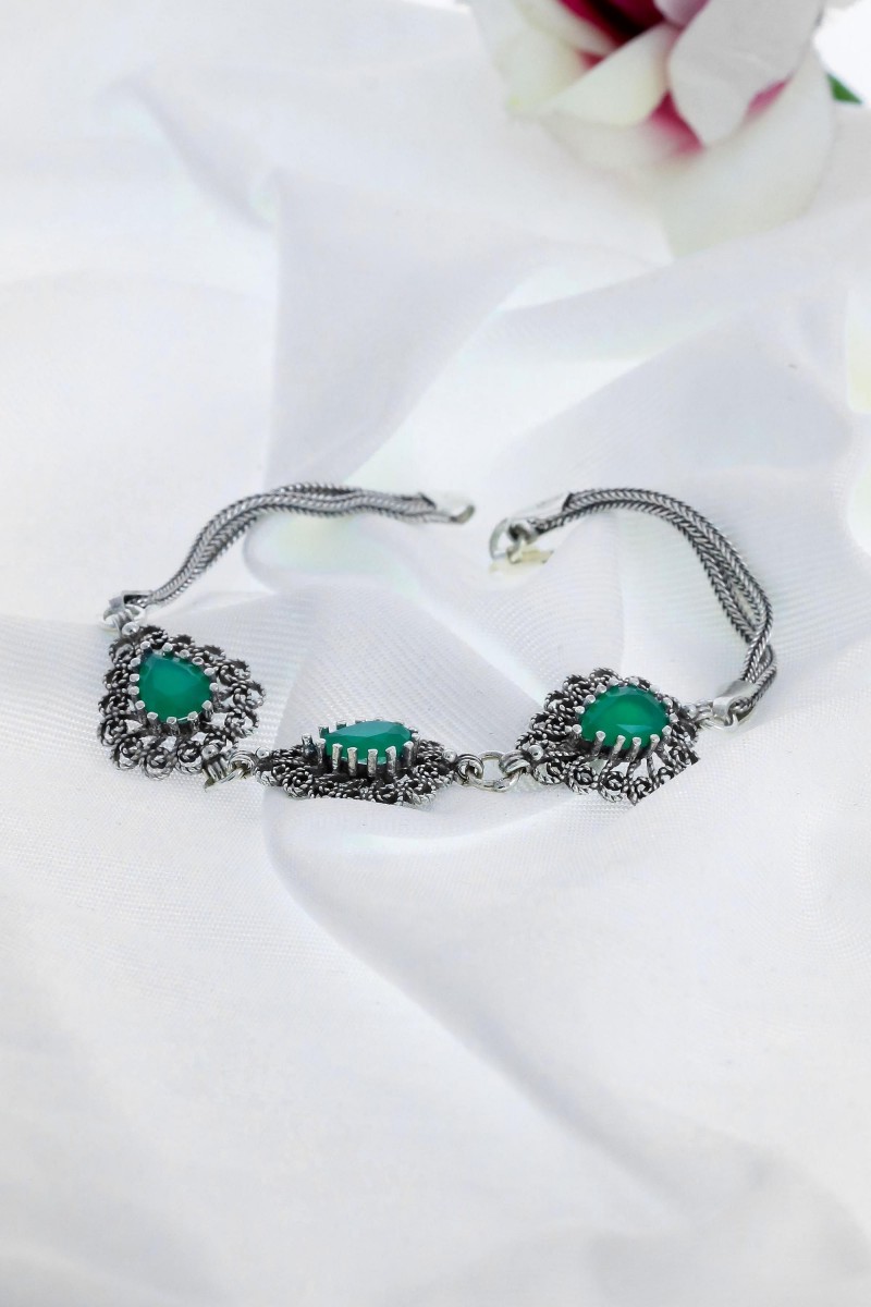 Damla Model Yeşil Zümrüt Taşlı El Işçiliği Telkari Gümüş Bileklik - SG20231135