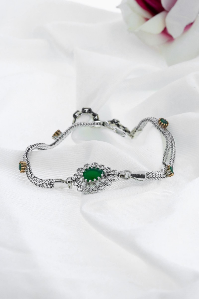 Damla Model Yeşil Zümrüt Taşlı El Işçiliği Telkari Gümüş Bileklik - SG20231136