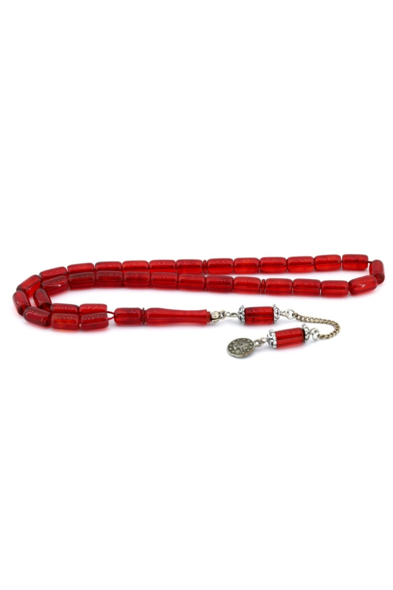 Kırmızı Kesme Gümüş Püsküllü Sıkma Kehribar Tesbih - SG20230409