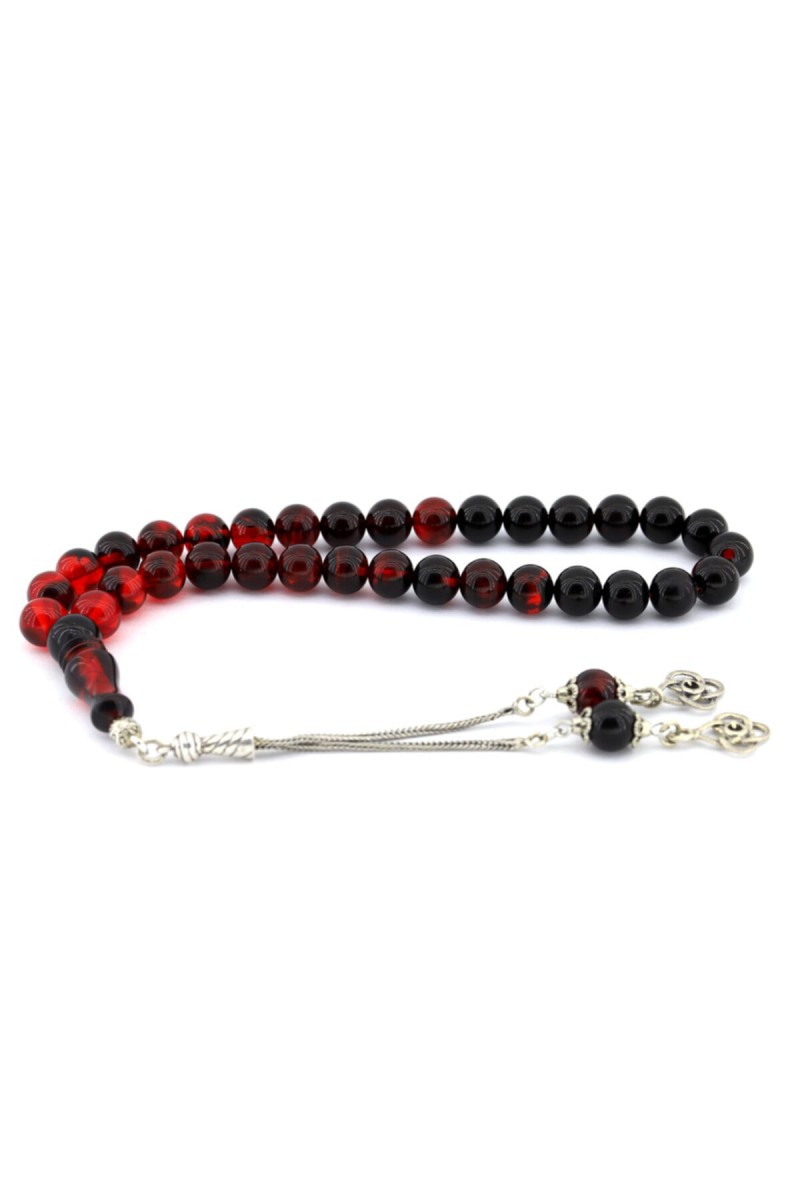 Kırmızı Siyah Gümüş Püsküllü Sıkma Kehribar Tesbih - SG20230395
