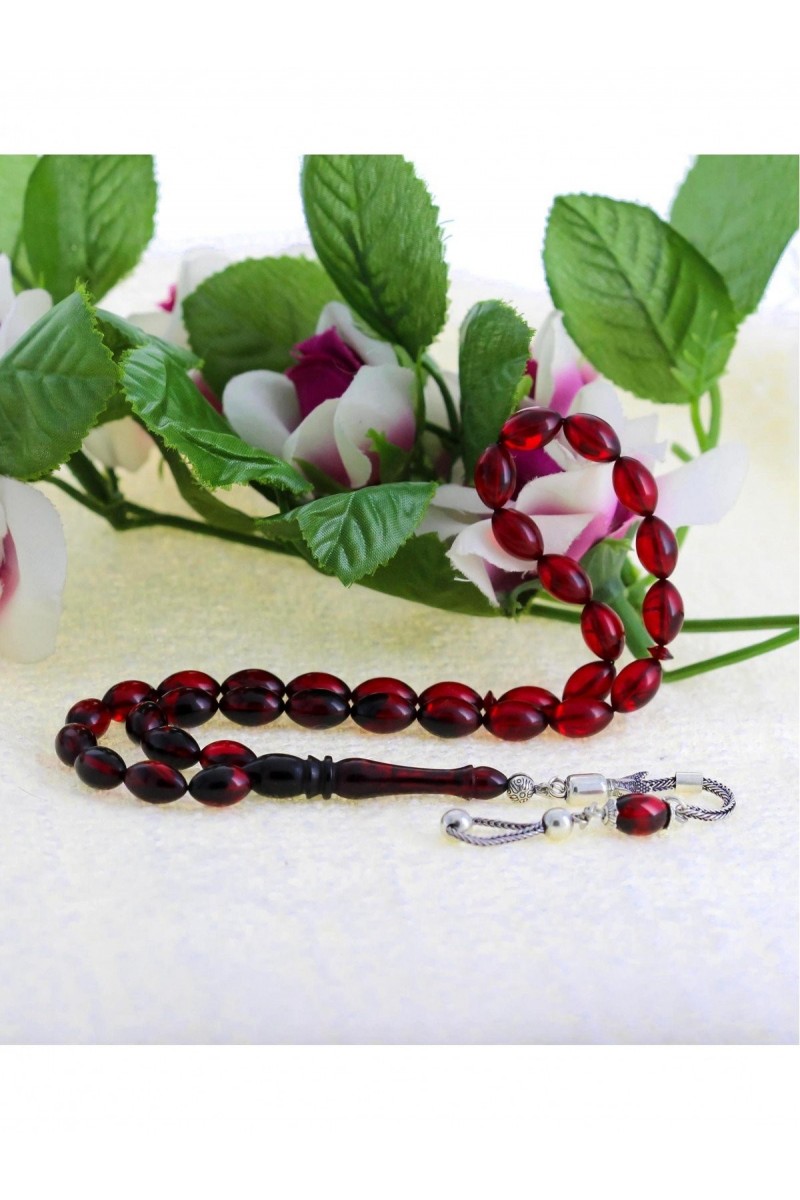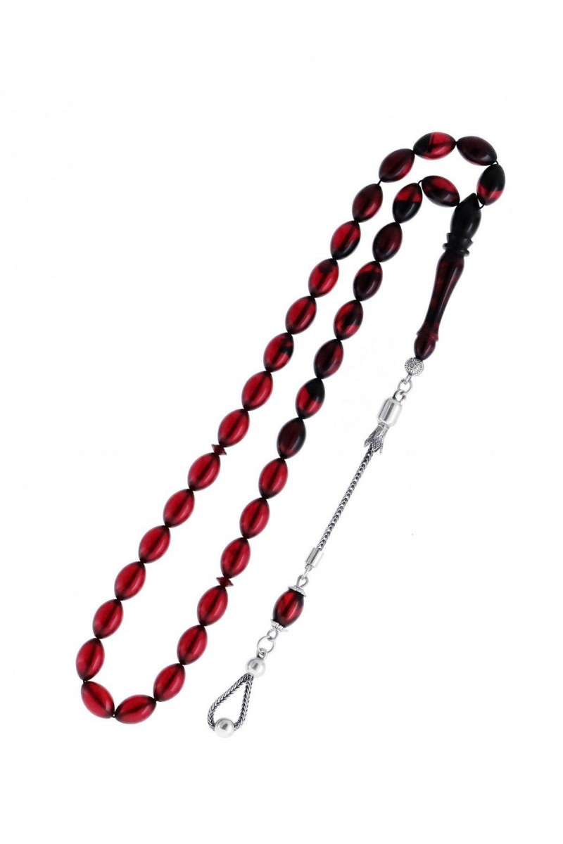 Kırmızı Siyah Hareli Gümüş Püsküllü Ateş Kehribar Tesbih - SG20230684