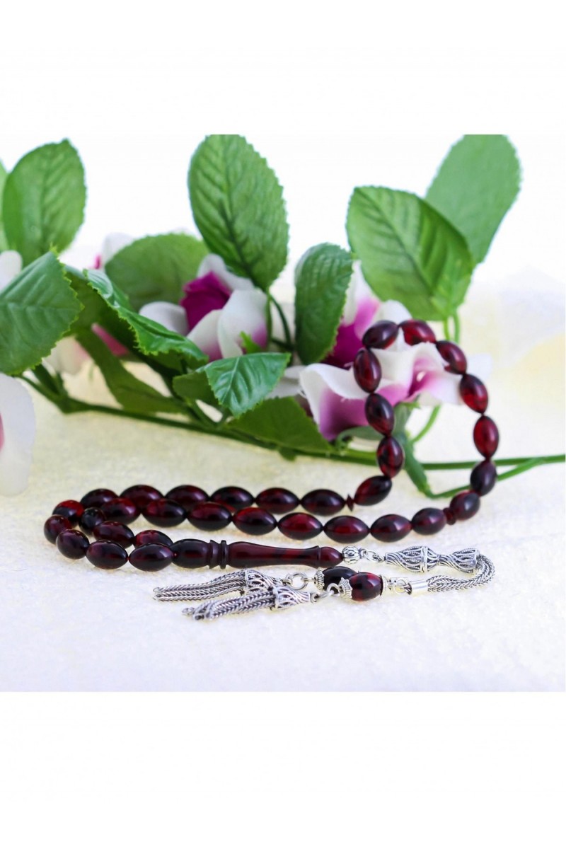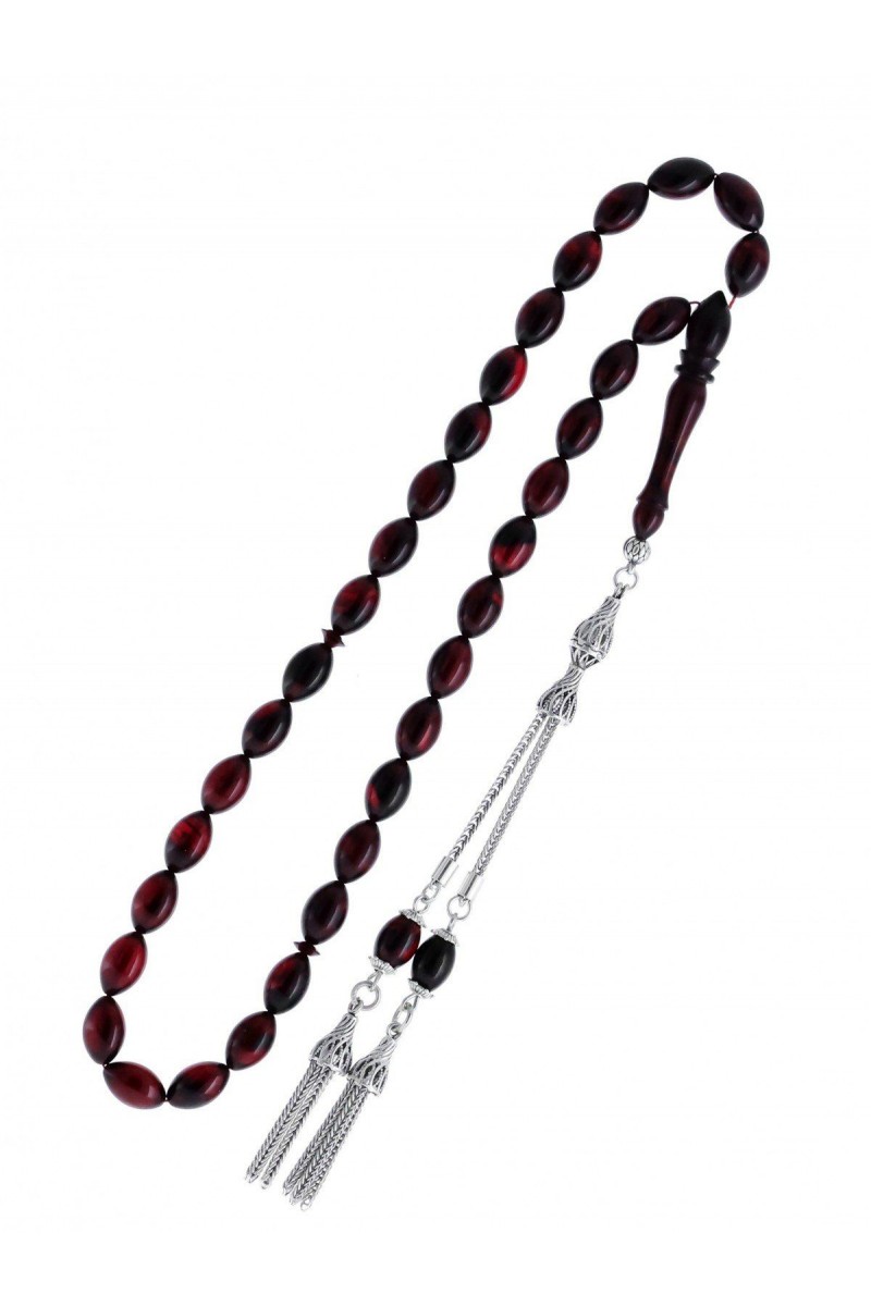 Kırmızı Siyah Hareli Gümüş Püsküllü Ateş Kehribar Tesbih - SG20230685