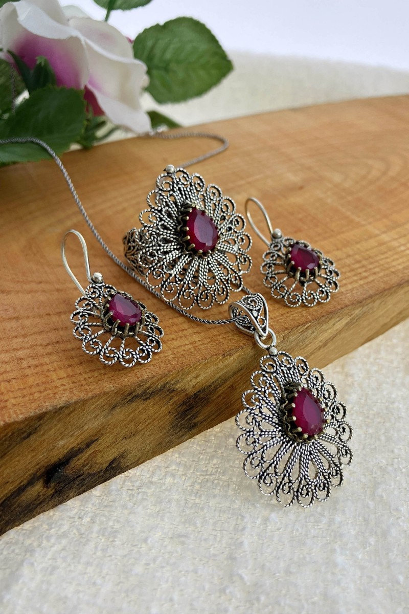 Ürün Hakkında : Kök-Yakut Taşlı Damla Model 925 Ayar Telkari Oksitli ÜçlüSet