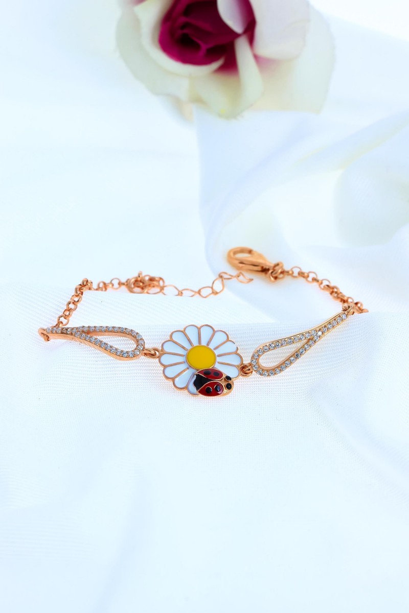 Rose Rengi Uğur Böceği Papatya Zirkon Taşlı Gümüş Bileklik - SG20231152