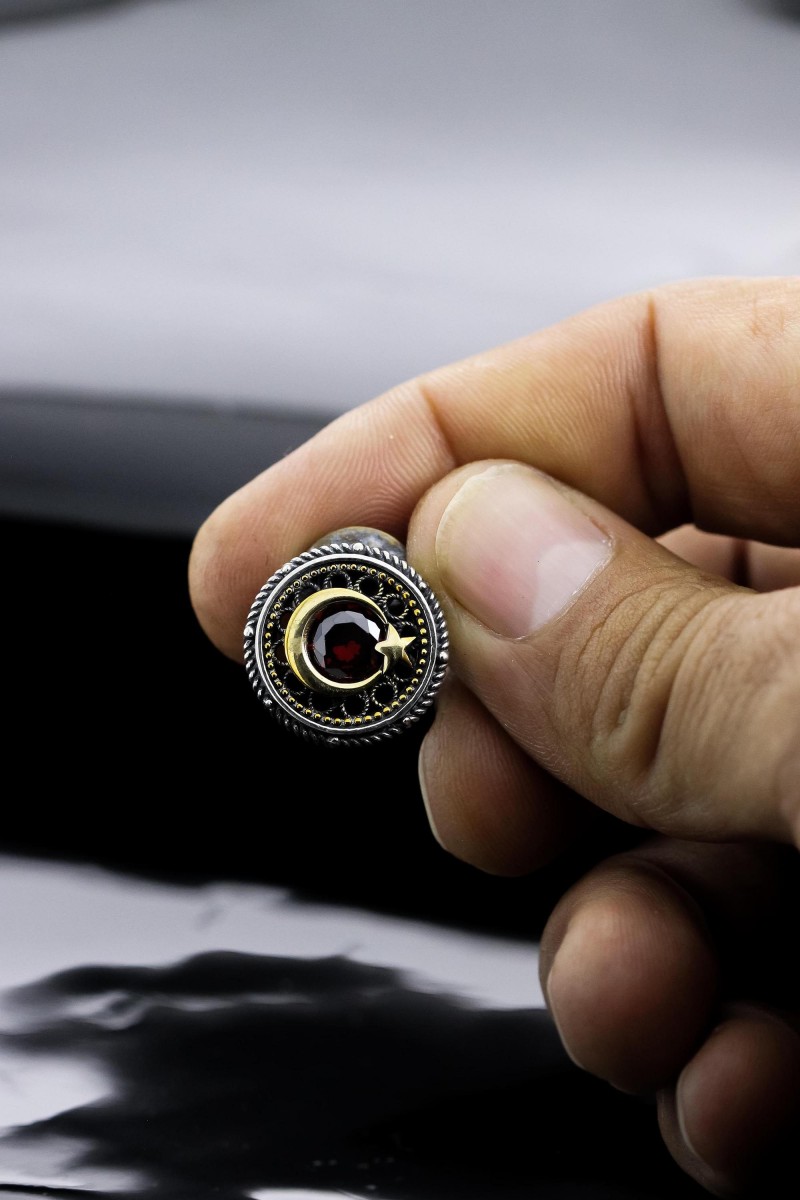 Türk Bayrağı Yakut Taşlı Oksitli Telkari Gümüş Rozet
