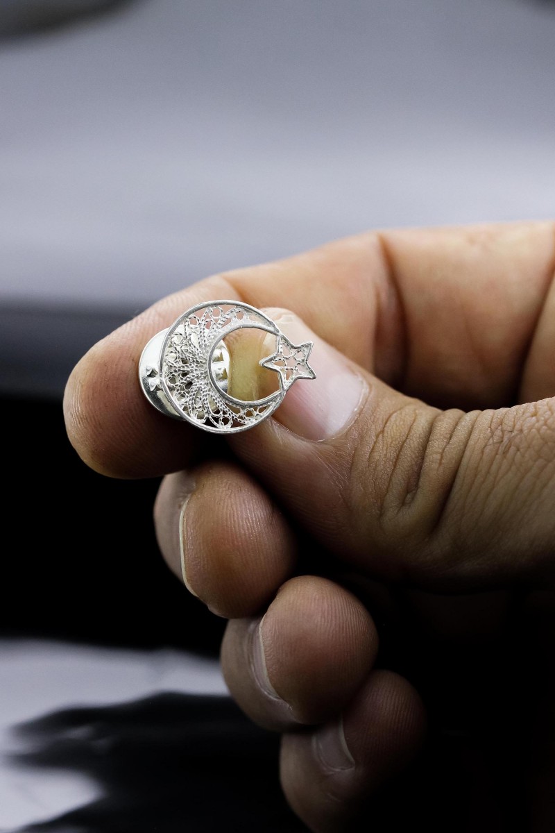 Türk Bayrağı Yakut Taşlı Telkari Gümüş Rozet - SG20230979