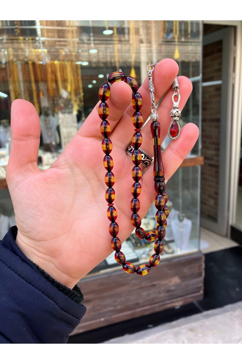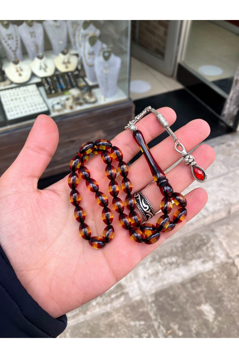 Sürmeli Toz Pres Kehribar tesbih Ürünümüzün uç kısmı kaliteli metaldan üretilmiştir.