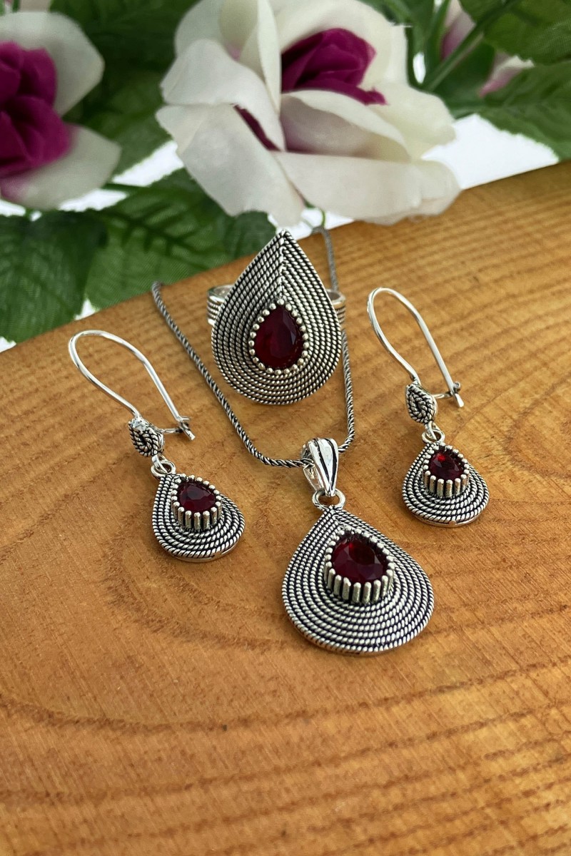 Ürün Hakkında : Yakut Taşlı Damla Model 925 Ayar Telkari Oksitli ÜçlüSet