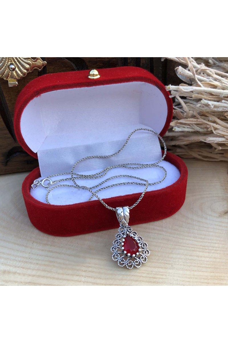 Yakut Taşlı Damla Tasarım Telkari Gümüş Üçlü Set - SG20230426