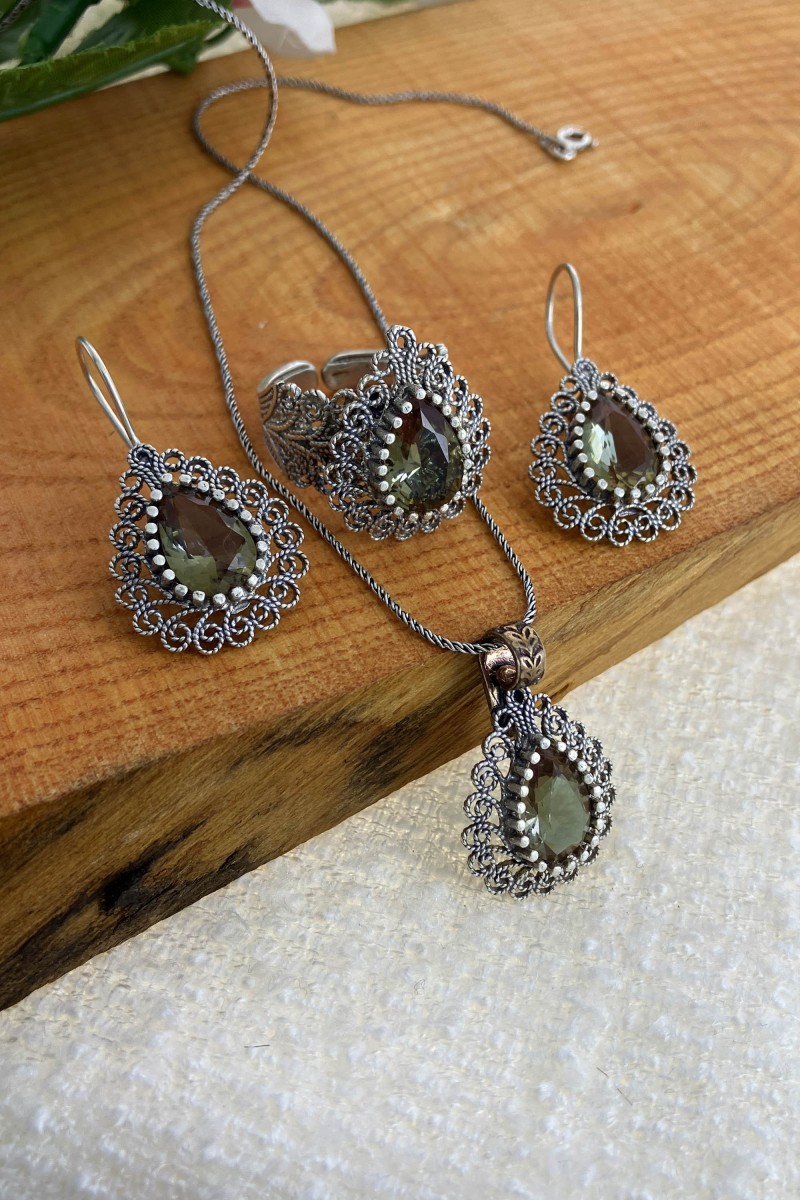 Ürün Hakkında : Zultanit Taşlı Damla Model 925 Ayar Telkari Oksitli ÜçlüSet